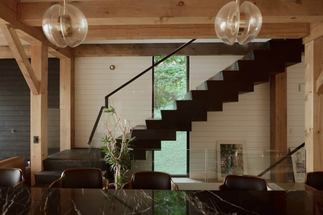 The ground floor features a mudroom, a giant kitchen, a living room with a wood-burning fireplace, and a dining room with a beautiful burl wood dining table designed for West Elm by my friend Jess. There is also a baby lemon tree growing out of the floor next to the island with a grow light above it on an automatic timer.